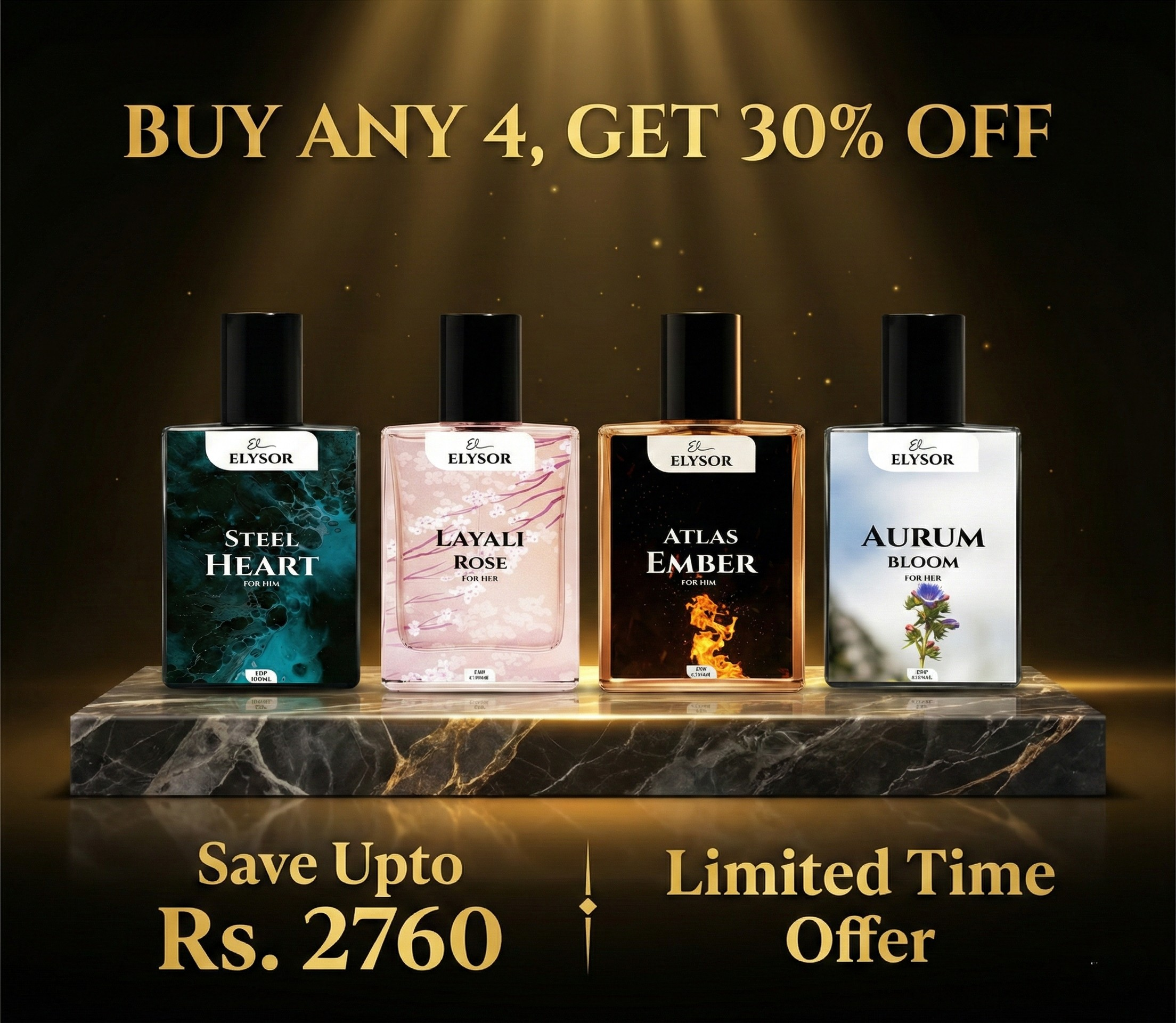 Enjoy the ultimate fragrance bundle. Buy four Elysor perfumes and receive 30% OFF — our best value offer.